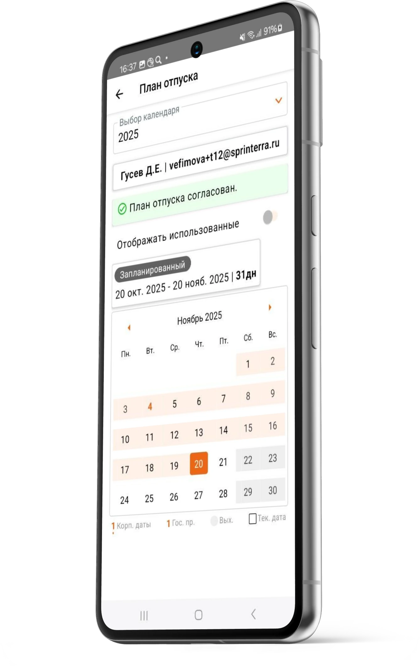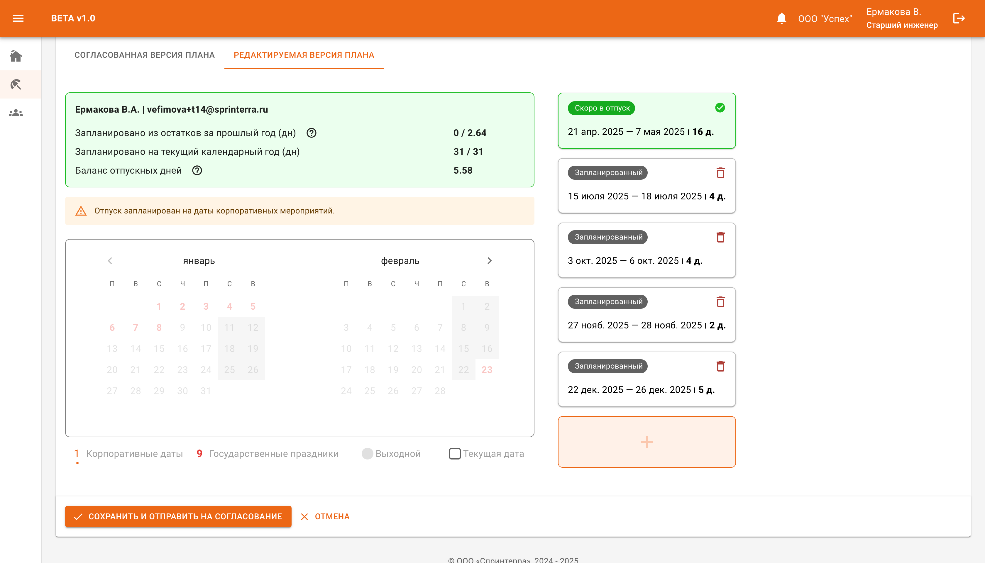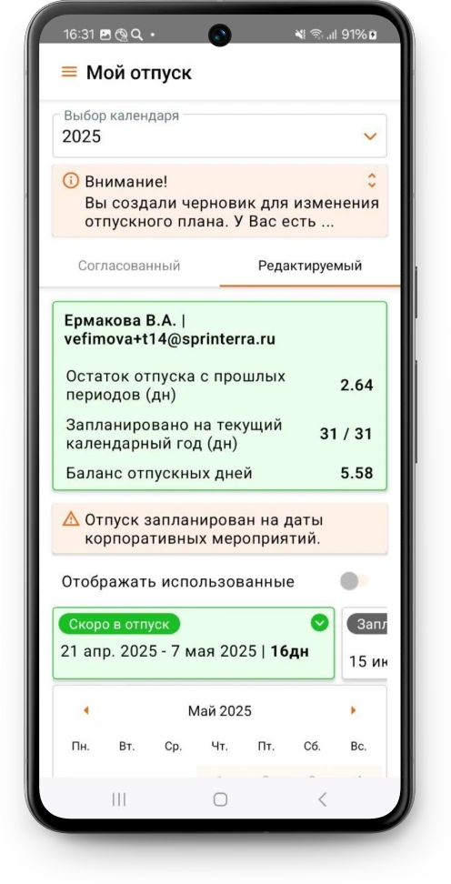 Всегда знает, сколько дней отпуска у него есть на данный момент, а также когда будут в отпуске его коллеги по команде. Для того, чтобы пойти в отпуск, ему не нужно создавать заявки или подписывать документы в офисе – он может оформить отпуск за пару кликов в календаре.